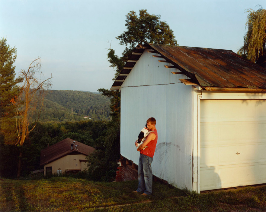 Shawne’s photograph of Jason and Buster in Kingsport, TN is of personal subject matter because the person in the photograph is his brother. It was taken at his brother’s home. Both of Shawne’s photographs in the show are different visually, but compliment each other emotionally and stylistically by evoking a similar ephemerality and closeness of heart. The photograph was taken at the house where his brother used to live. Shawne said, “ My brother was in the process of getting rid of the dog and he was having a hard time with it because he really liked the dog. His wife was about to have a baby and even though he loved the dog, they felt that it was too wild to have around a baby. It was a crazy dog that would jump around all over the place and would run and jump up on people and also up into Jason’s arms. They found a guy that had a farm and gave the dog away to him.” The golden setting sunlight is the perfect metaphor for the story that the photograph tells. The image looks like home, not a specific home, just home.