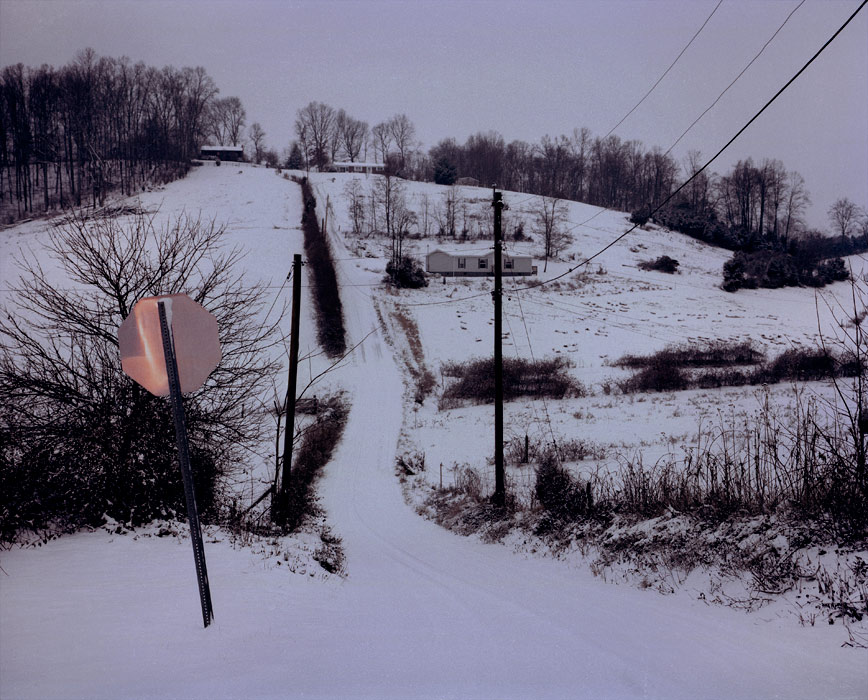 The trees on the top of the hill appear to match the movement of the ones in the foreground, but really they are quite different in their shape and distribution. The accomplished awareness of what potentially exists in front of the photographer allows the trees to create two flowing parallel lines that dip down, mimicking each other in the composition of the photograph. The modest homes have a perceived remoteness that is further emphasized by the near monotone contrast provided by the snow. These things, in addition to the presence of the ambiently lit stop sign, give a subtle description and obscure insight into the lives of the people that live on this hill in Piney Flats, Tennessee.